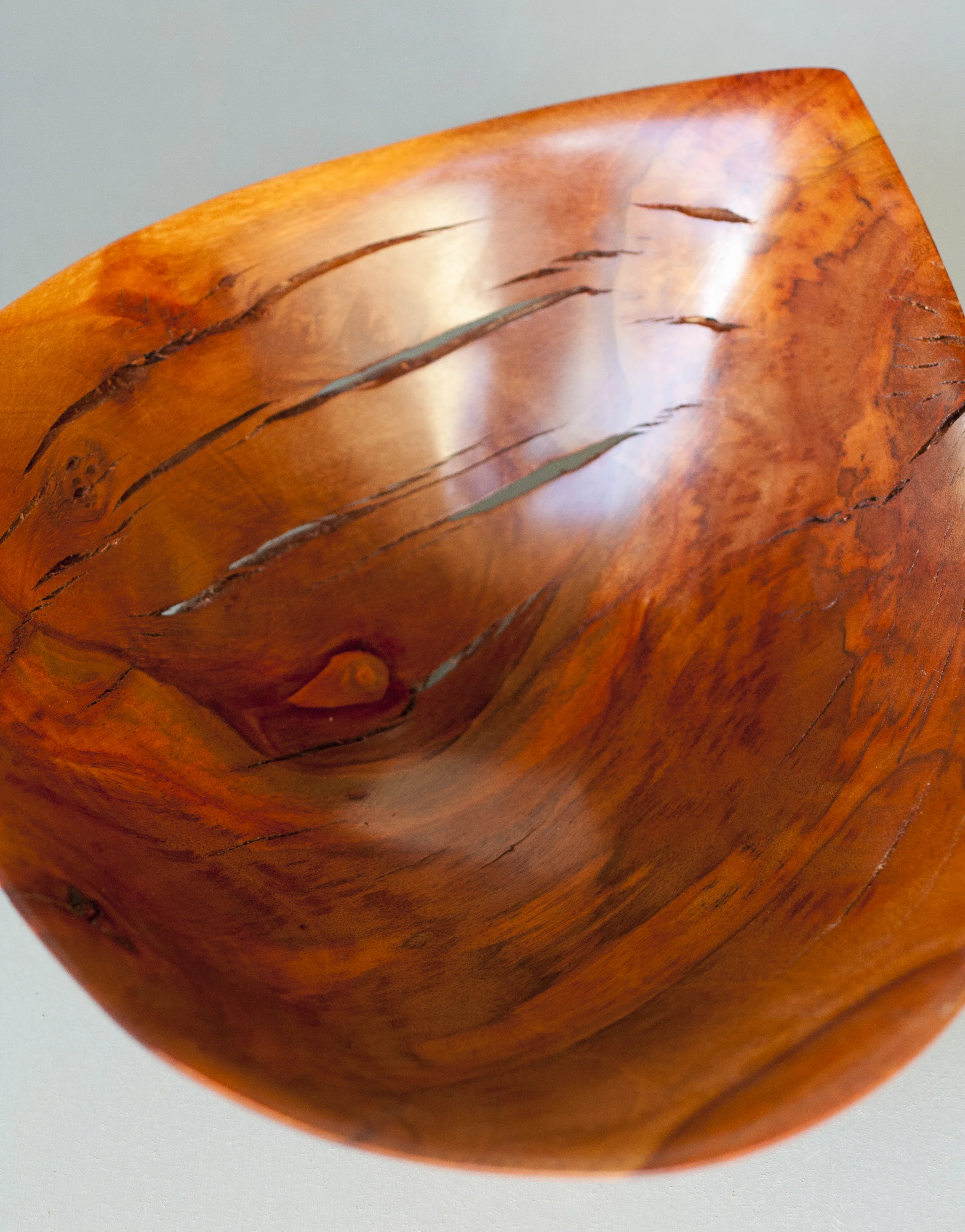The trees that grow around where I live here in Hawaii have some of the most beautiful and unique grain patterns in the world. When I'm working with wood I like to make forms that are asymmetrical and move with the wood grain. I try to make forms that accentuate the grain patterns as I hand carve my bowls. Most of the wood that I use comes from tree trimmers. I don't like cutting down trees.